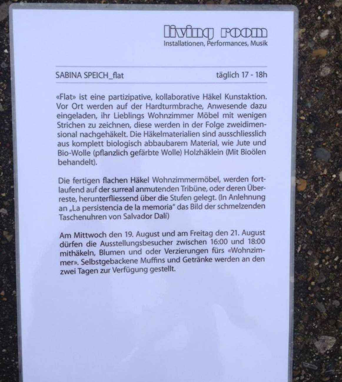«Flat» war eine partizipative, kollaborative Häkel Kunstaktion. Vor Ort wurden auf der Hardturmbrache, Anwesende dazu eingeladen, ihr Lieblings Wohnzimmer Möbel mit wenigen Strichen zu zeichnen, diese wurden in der Folge zweidimensional nachgehäkelt. Die Häkelmaterialien sind ausschliesslich aus komplett biologisch abbaubarem Material, wie Jute und Bio-Wolle (pflanzlich gefärbte Wolle) Holzhäklein (Mit Bioölen behandelt). Die Biowolle und die Holzhäklein sind von Anna & Juan